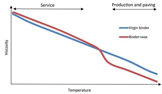 Figure 1: The principle of wax modification of asphalt binders: below its dissolution point, the wax increases the viscosity of the binder. On the contrary, it lowers its viscosity above thus contributing to an enhanced workability at a given temperature. Reproduced from http://zaumanis.com with permission