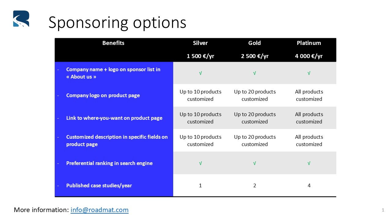 Our sponsorship options are given below. If you want to know more and think about joining the sponsor list, please don't hesitate to contact us (info@roadmat.com).