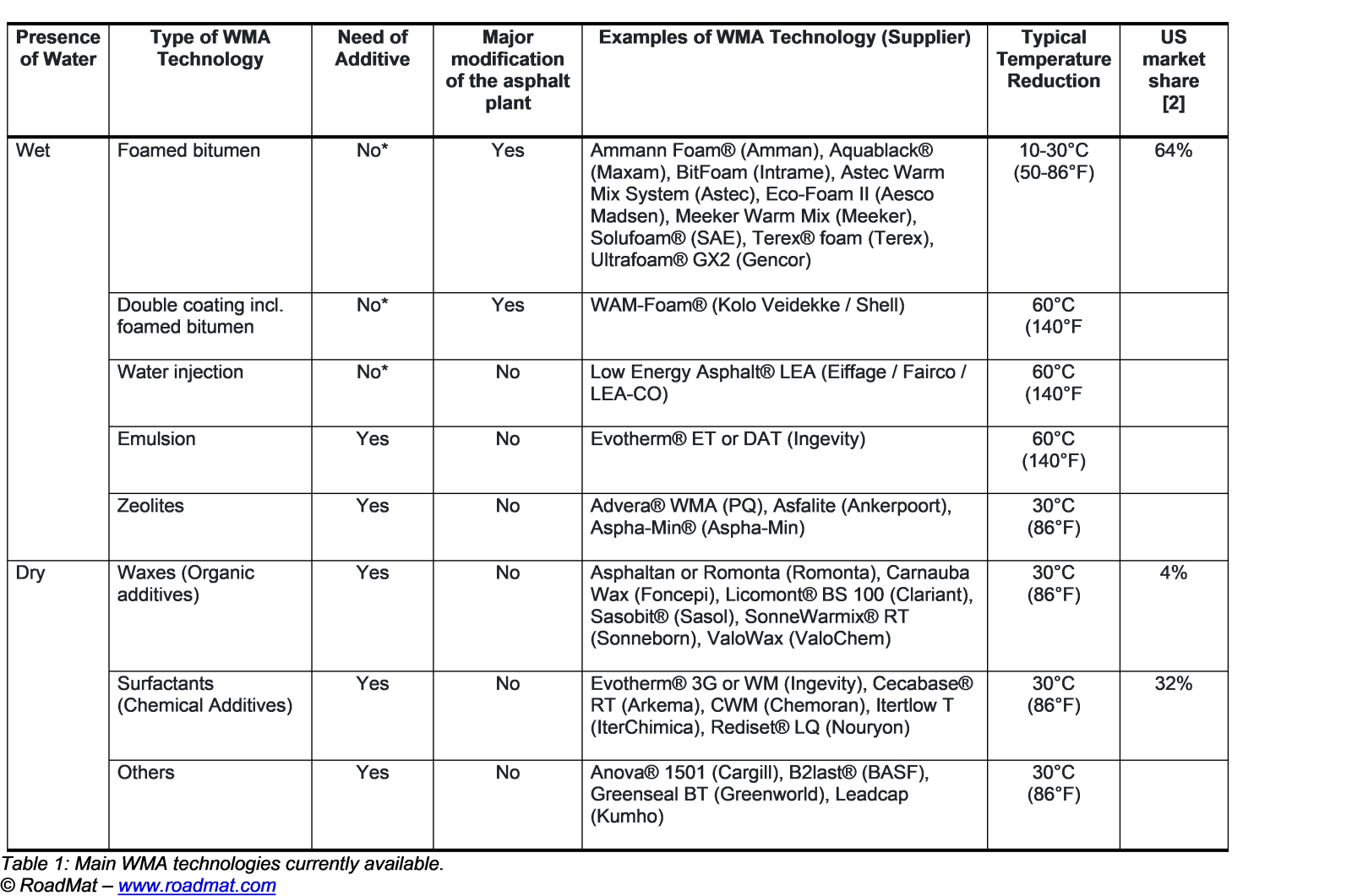 There are several ways to reduce the manufacturing temperature (Table 1). Basically, there are two main routes, one based on adding water and the other based on adding an appropriate additive. Combinations of both also exist, with some technologies being based on a water-releasing agent such as a zeolite or using a bituminous emulsion. Some technologies that were proposed in the early stages of development, have also essentially disappeared such as the use of two grades of binder (sequential coating), the soft one acting as a lubricant for the harder one.